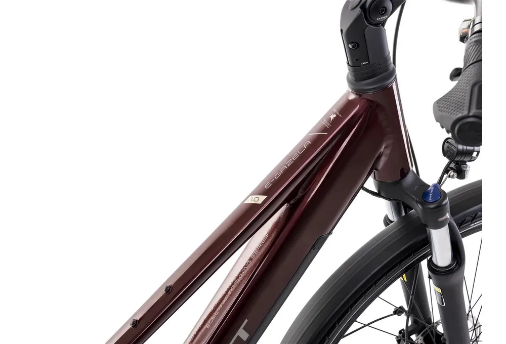 Romet E-Gazela 1.0 504 Wh to nowoczesny rower trekkingowy dla kobiet, łączący elegancki wygląd z innowacyjnymi rozwiązaniami technologicznymi. Zaprojektowany z myślą o komfortowych podróżach, zarówno w miejskich, jak i bardziej wymagających terenach. Dzięki pojemnej baterii, mocnemu silnikowi oraz kompletnemu wyposażeniu, E-Gazela doskonale sprawdzi się jako środek transportu lub towarzysz długich wypraw.