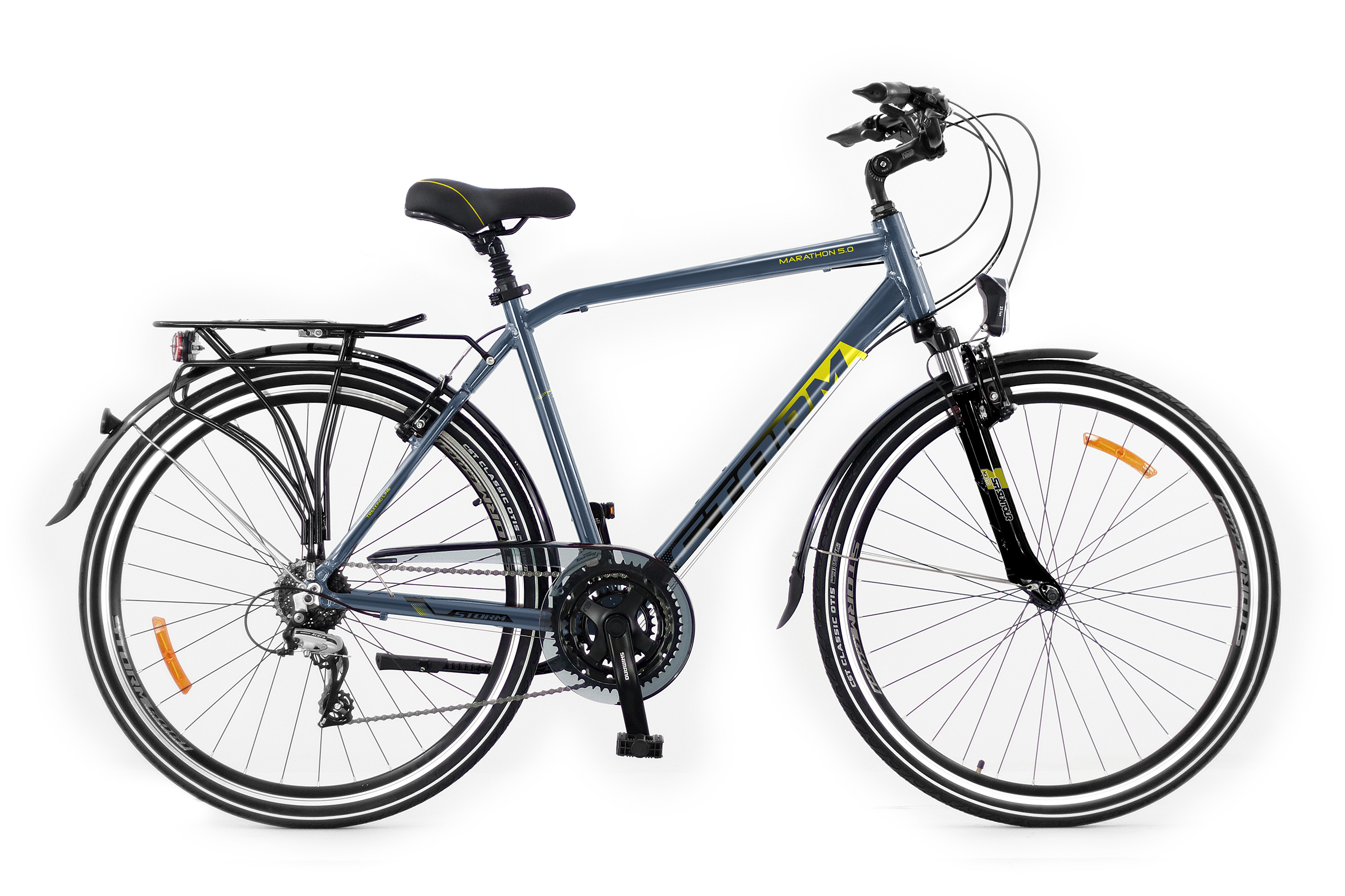 Storm Marathon 5.0 to propozycja dla osób poszukujących funkcjonalnego roweru trekkingowego, który sprawdzi się w codziennym użytkowaniu oraz podczas dłuższych wypraw rekreacyjnych. Solidna aluminiowa rama, amortyzowany widelec SR Suntour i 24-biegowy napęd Shimano to połączenie wygody, trwałości i uniwersalności.