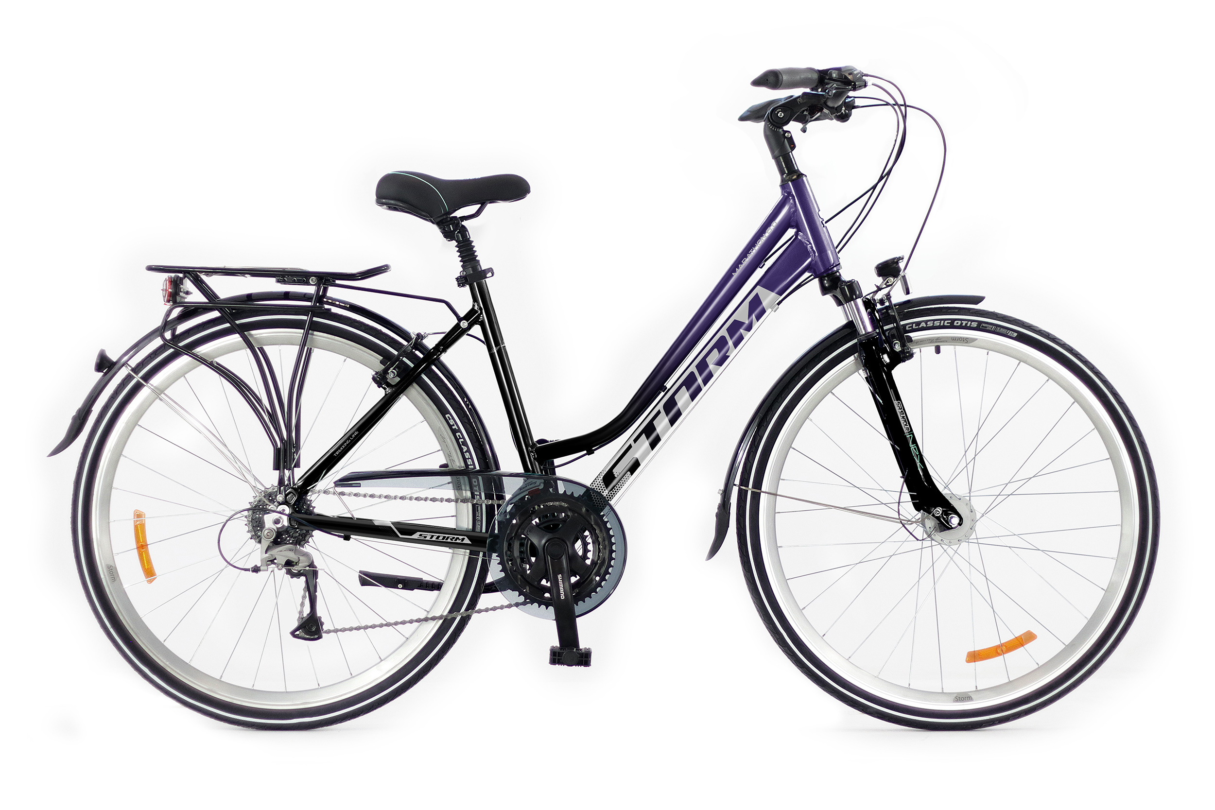 Storm Marathon 6.0 Lady to dopracowany rower trekkingowy, który zapewnia wygodę i bezpieczeństwo w każdej codziennej trasie. Dzięki amortyzacji, oświetleniu, dynamie i solidnemu osprzętowi Shimano, spełni oczekiwania wymagających użytkowniczek, które szukają połączenia praktyczności, jakości i klasycznego stylu.